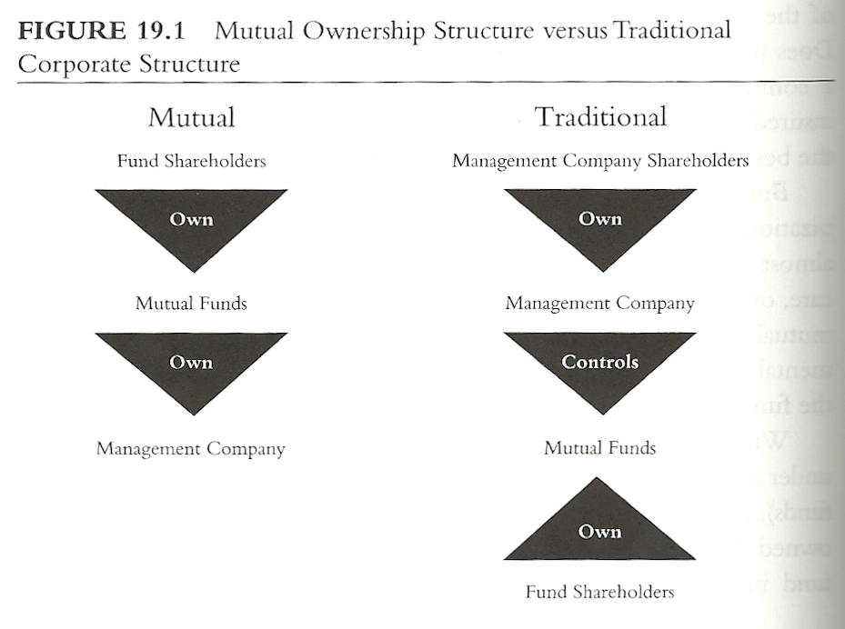 En un fondo de inversión tradicional, la gestora controla los fondos de los inversión, y esa gestora pertenece exclusivamente a los empresarios que la regentan. Sin embargo, en los fondos realmente mutuos como los de Vanguard, la estructura es más simple, ya que los inversores son también los dueños de los fondos, con la diferencia de que los dueños de la gestora son los propios fondos de inversión. Esto también viene explicado en Los Cuatro Pilares de la Inversión, de W. Bernstein.