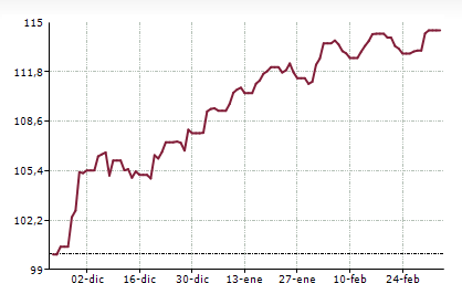 Ahora la cartera está sobreponderada en renta variable, y tiene esta composición precisamente porque tras la «caída del miedo» de finales de noviembre que probablemente provocara ventas masivas de acciones envueltas en brotes de pánico, la renta variable global ha desarrollado un espectacular repunte de tres meses. Este es el rendimiento de la cartera tras el pánico vendedor de noviembre: