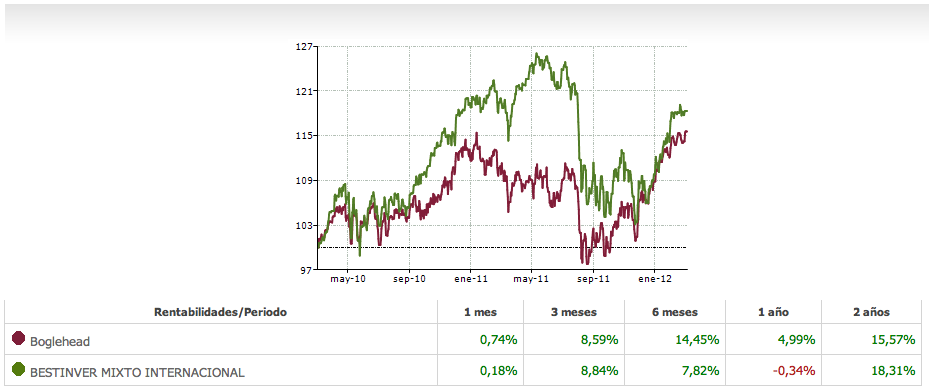 Por último y como punto vanidoso de la entrada, os dejo el track de los últimos dos años de mi cartera enfrentada con los fondos de referencia que sigo para comparar mi gestión pasiva con la gestión activa estrella de los últimos tiempos: Bestinver Mixto y Bestinver Mixto Internacional.