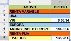 2. Precio. La segunda columna la vamos a usar para el precio de ETFs o acciones, y valores liquidativos de fondos. Esta es la parte más difícil.