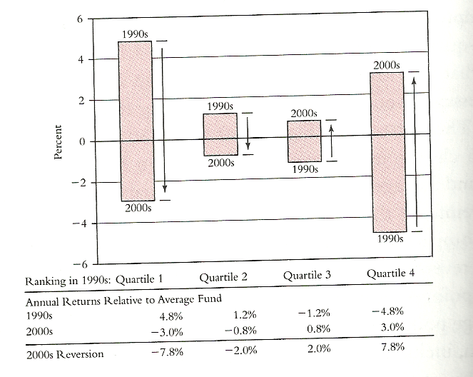 Como vemos en el siguiente gráfico, los fondos de inversión que se situaron en el primer cuartil de rentabilidad en la década que terminaba en el año 1990 (4,8% de rentabilidad media), pasaron a ser los menos rentables en la década posterior, con una rentabilidad del -3%. Una diferencia de rentabilidad del -7,8%, lo que demuestra, otra vez más, que rentabilidades pasadas no implican rentabilidades futuras.