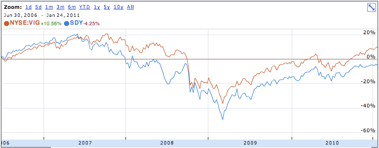 @Albert, son gráficos de las cotizaciones, por lo que los dividendos no cuentan. Teniendo en cuenta los impuestos, con añadir un 1% anual al SDY tendríamos la diferencia real de ambos en el gráfico adjunto.