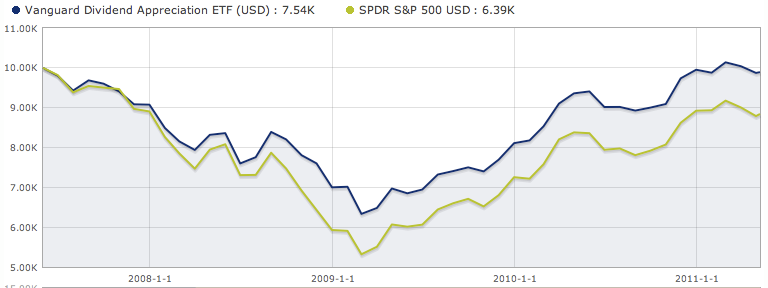 Os adjunto un interesante gráfico en el que se muestra una comparativa entre el Vanguard Dividend Appreciation ETF y el SPDR S&P 500 ETF. Vendría a corresponder a algo así como el enfrentamiento entre el mercado de las acciones americanas contra la selección de empresas que elevan su dividendo año a año a pesar de los momentos de peor crisis económica.